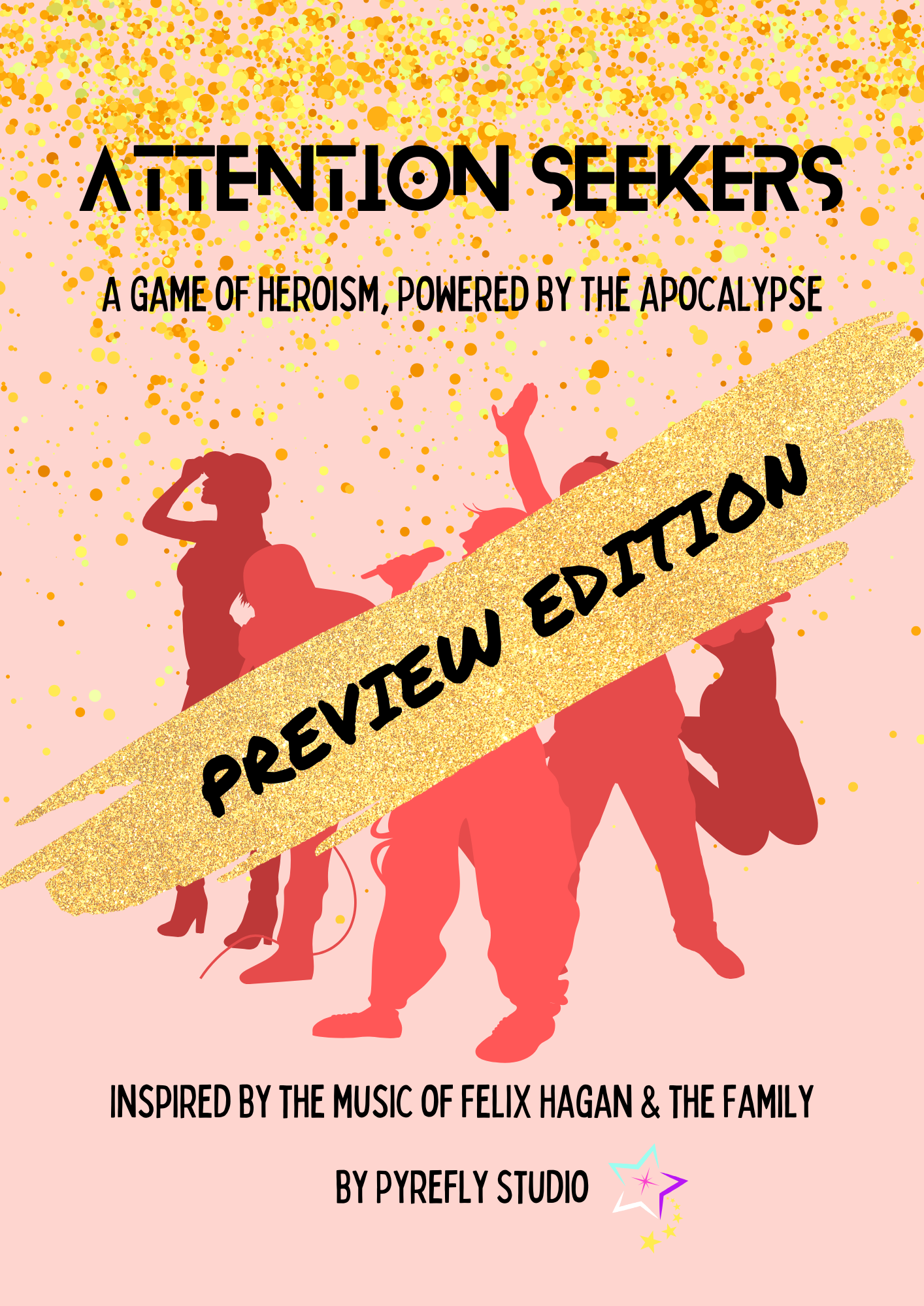Attention Seekers is a game about being a Hero — with a capital H — for the people, earning their love and respect, and using the power of those relationships to fight the forces of evil and oppression. If you like rock operas, this is the kind of magical realism for you. Become the underdog hero fighting with the powers of hope and friendship that you've always dreamed of!