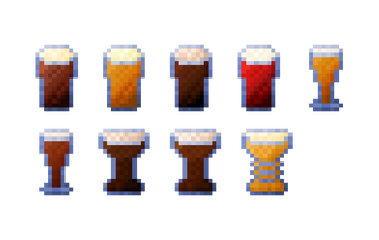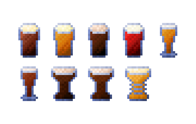 I've been making a lot of 16x16 pixel art for my husband's Minecraft mods, and (with his permission) I'm making them available for others to use, as well! This is a pack of nine beer sprites— Nut Brown Ale, Cream Ale, Porter, Red Ale, Pilsner, Bock, Stout, Milk Stout, and IPA— all served in their appropriate glassware.